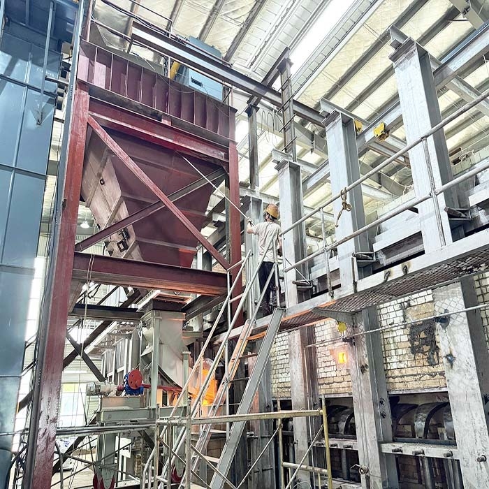 Materiały zbiorcze są wprowadzane do pieca przez domek dla psów, a ciepło jest przenoszone przez przestrzeń płomienia do szklanego płynu.